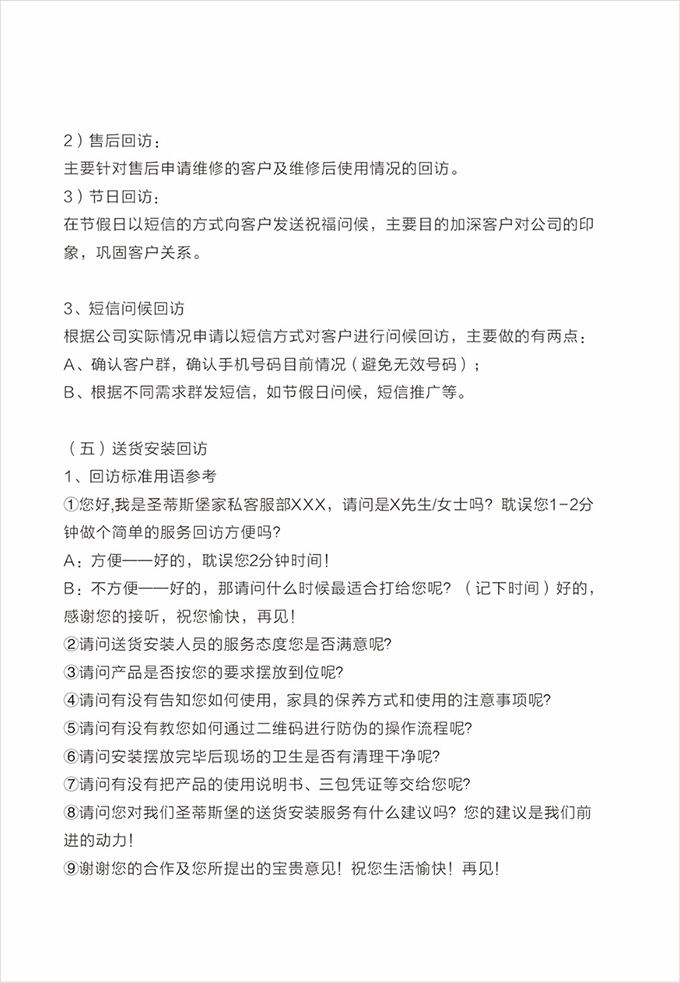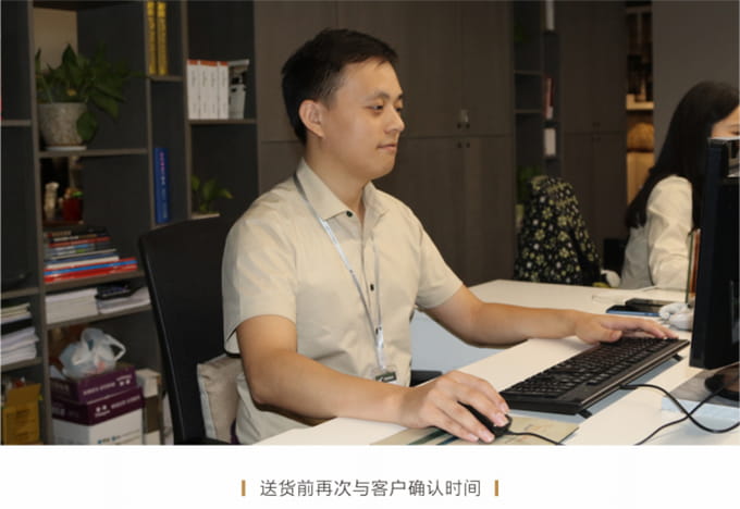 话术参考:“**先生/女士您好,我是bwin必赢国际的售后服务人员**,您购买的bwin必赢国际家具已经全部到货了,送货安装大约需要**时间,请问您这边什么时候方便我们上门送货安装呢?”同时要了解送货小区的电梯、楼道、入户门的尺寸等,提前做好准备,避免意外情况。最后确定送货时间(安装所需要时长),并告知客户安装人员的相关信息,可加微信发送,并发送配送安装流程说明。