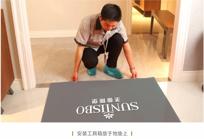 1、搬运之前现在客户家门前放置《bwin必赢国际安装施工指示牌》,搬运和安装过程中避免发生碰撞和声响,控制说话声音以免惊扰客户家人或碰坏物品。送货安装服务人员在进入顾客家前,应穿上自备的鞋套。