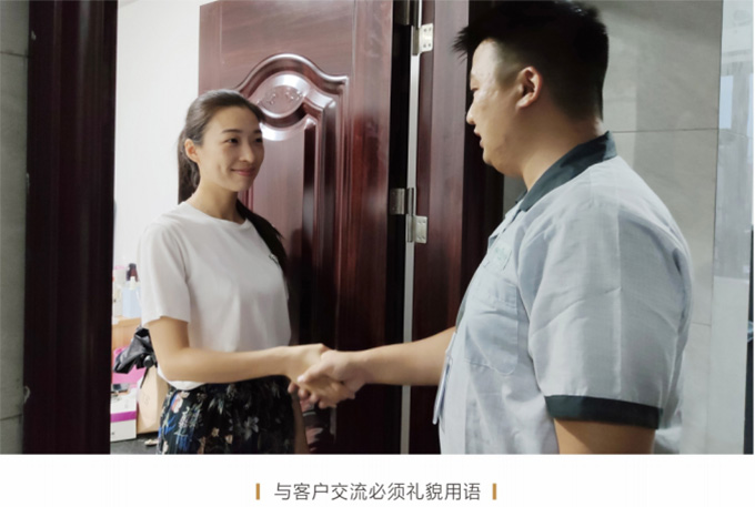 必须按照客户约定,至少提前5分钟上门,见到客户时需自我介绍,并出示上岗证和名片,在进入顾客家前应穿上自备的鞋套。征得客户同意后开始维修,严禁乱收费。